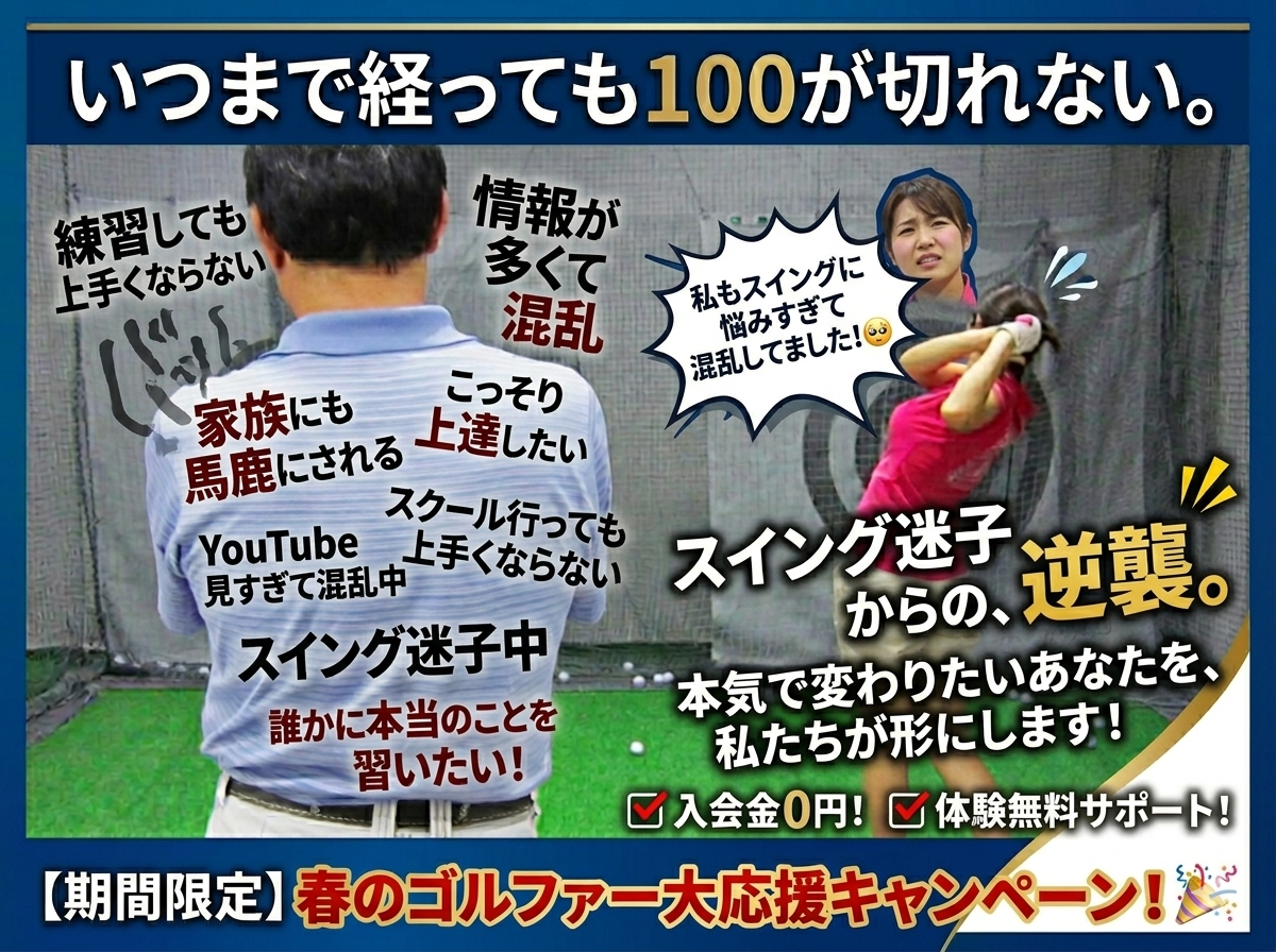 春の【期間限定キャンペーン】YouTubeでも、他のスクールでもゴルフが良くならない方へ、練習の正解が見えず成長がない、ライバルに勝てないゴルフを変えたい!スコアアップ!飛距離アップ「本気の執念」を応援!