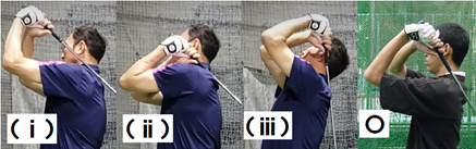 正しい右手首と右肘の動きで左肩の上にクラブシャフトと左腕の三角形を作るスイング習得しましょう。肘がたためてない(ⅰ)、コックが少ない(ⅱ)、コックが遅く肘が上がりすぎる(ⅲ)三角形はNGです。