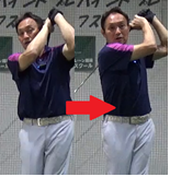 ここではクラブの縦入れ感覚で左腕とクラブシャフトの三角形を作った後、体の回転でクラブの横入れを行いフルスイングのフィニッシュ姿勢を作ります。この練習ではクラブの縦入れ時点では、肘を上げ過ぎないこと下げすぎないこと、そして横入れ時点では肘を下げないことに注意してくだい。