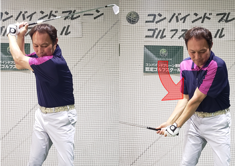これに対して、右腕主体のダウンスイングでは腕の動きに角ができ、インパクトエリアで不規則な筋緊張を作りだしてしまします。これはボールヒットの際のヘッドスピードにバラつきを大きして飛距離にバラつきを発生させるだけでなく、インパクト時のフェース面もばらつかせてしまうので曲がるショットも増やしてしまいます。