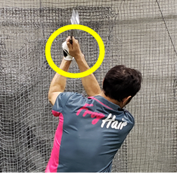 ⑩バックスイングフェース向き確認:8時、L字、フルスイングのトップオブスイングという3局面で右手の甲に角度を作らない感覚を確認してください。